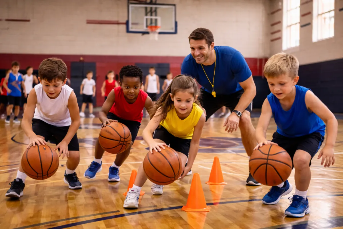 Focus on dribbling, shooting, passing, and defensive fundamentals